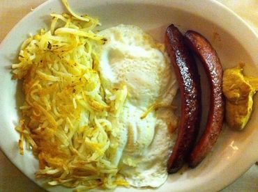2 eggs, polish sausage or bratwurst, hash browns or grits, and toast or biscuits