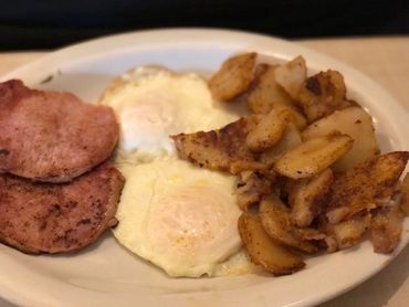2 eggs, smoked pork loin, hash browns or grits, and toast or biscuits